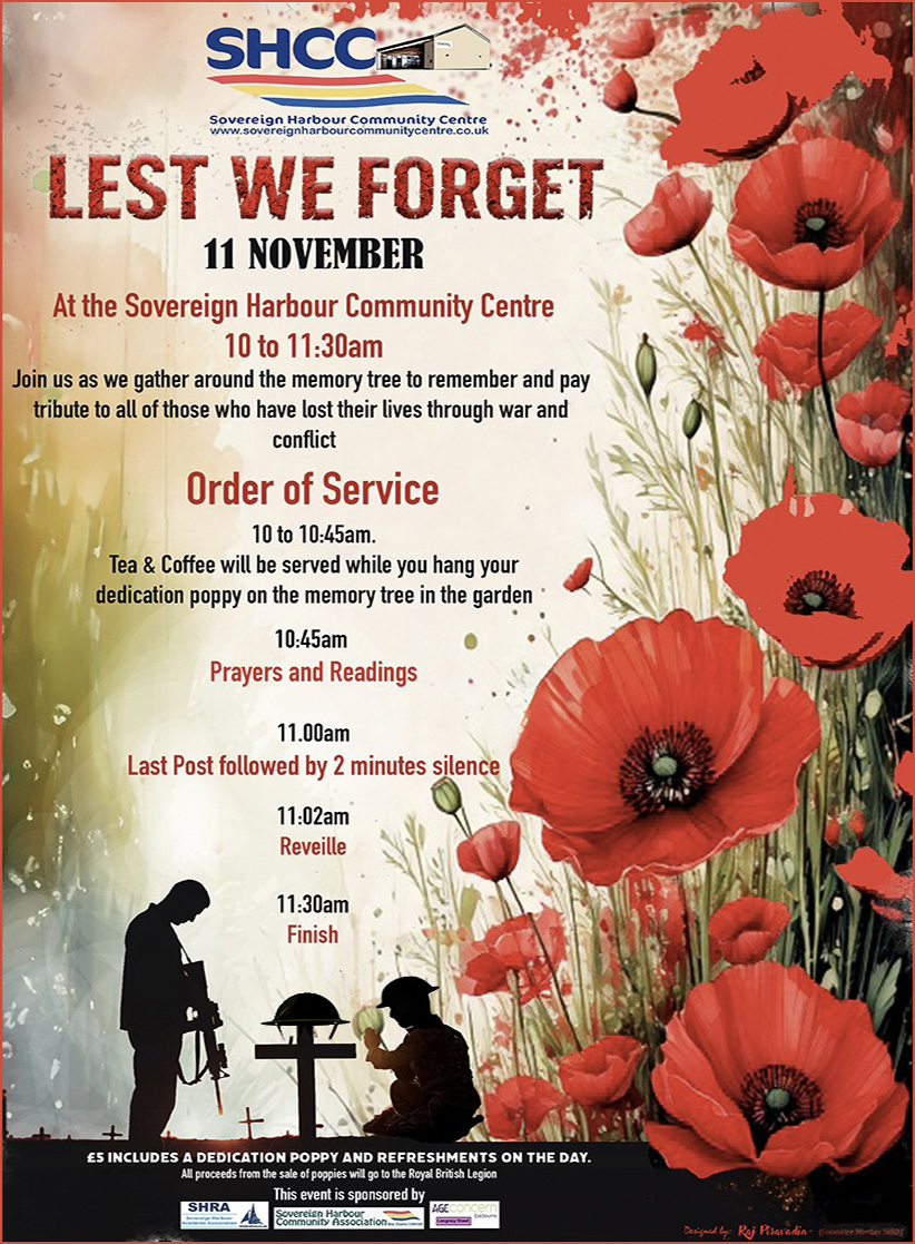 03 November - Remembering Those We Have Loved - With the help of SHRA and members of the Langney Shed, the Sovereign Harbour Community Association (SHCC), which manages the community centre, is creating a Memory Corner in the centre’s garden. The space will feature a memory tree and will provide residents with a quiet place to reflect and remember those they have loved and lost.