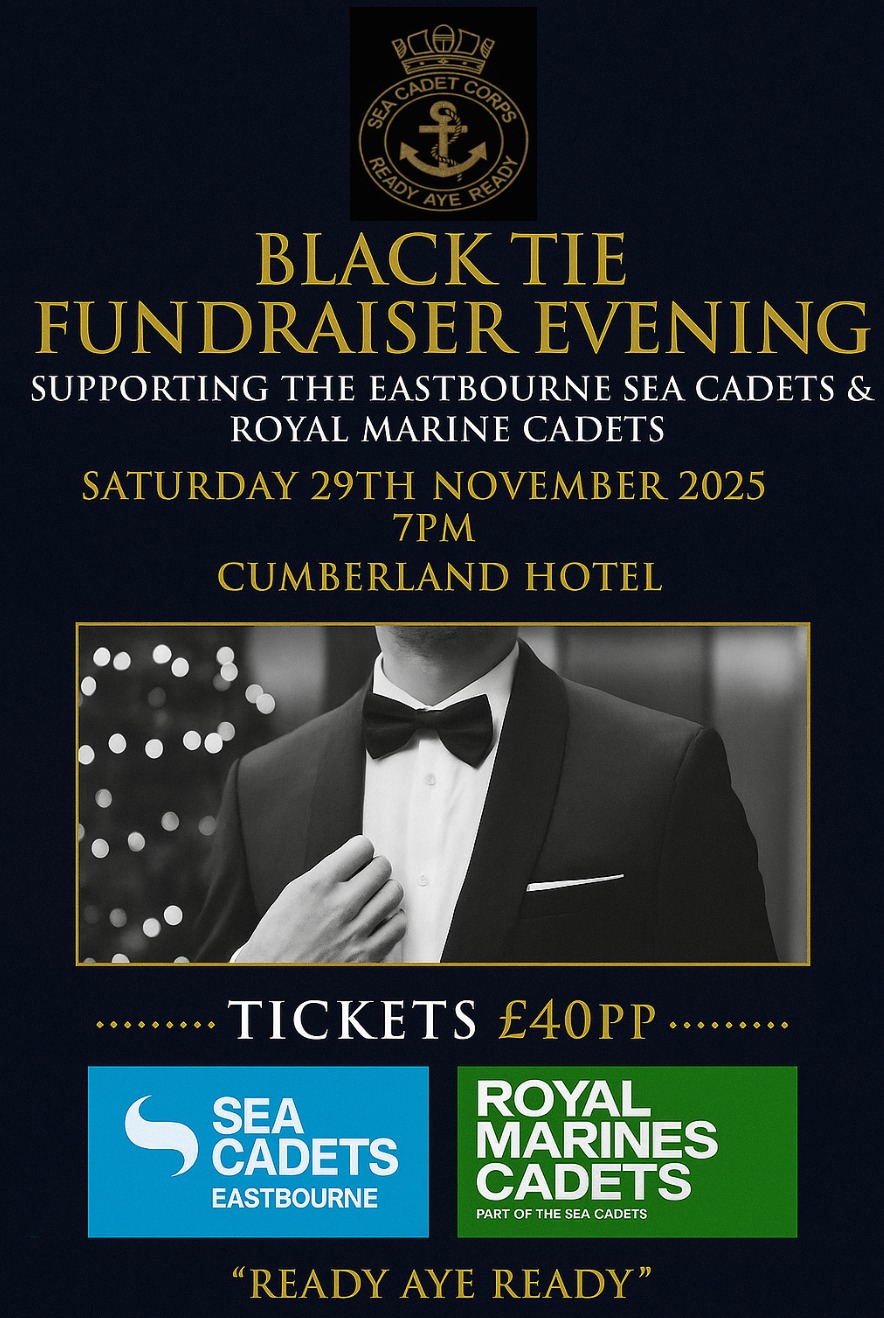 07 November - Black Tie Fundraiser Evening, 7pm, Saturday 29th November. You are invited to a very special evening at the Cumberland Hotel in support of the Eastbourne Sea Cadets and Royal Marine Cadet Detachment.