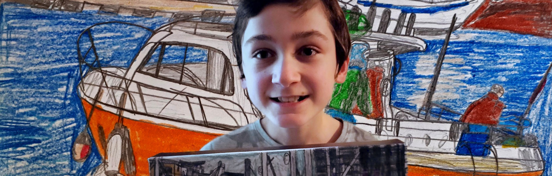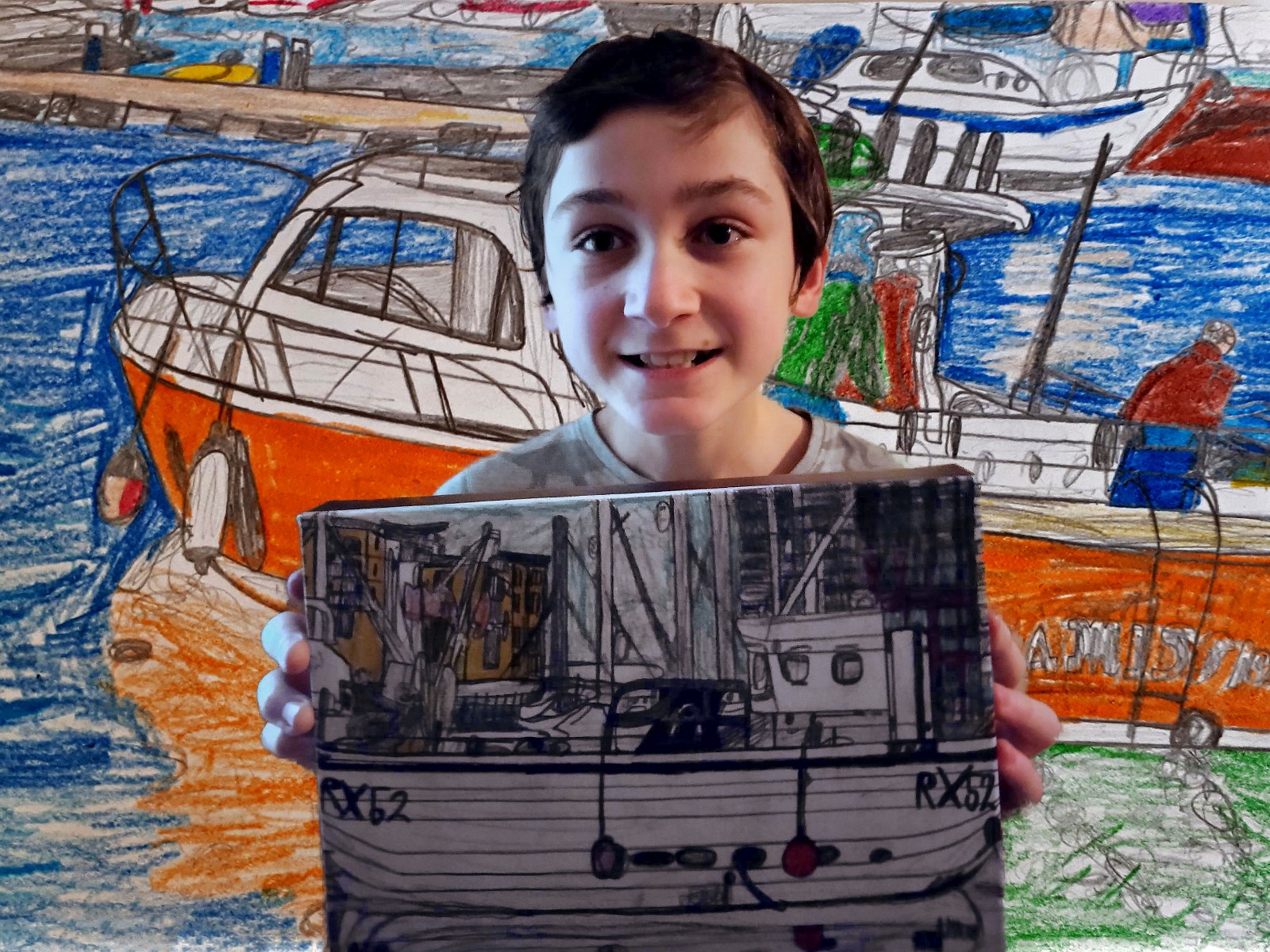 Oliver in early 2021 with his drawings of 'RX52' and 'On a Mission'