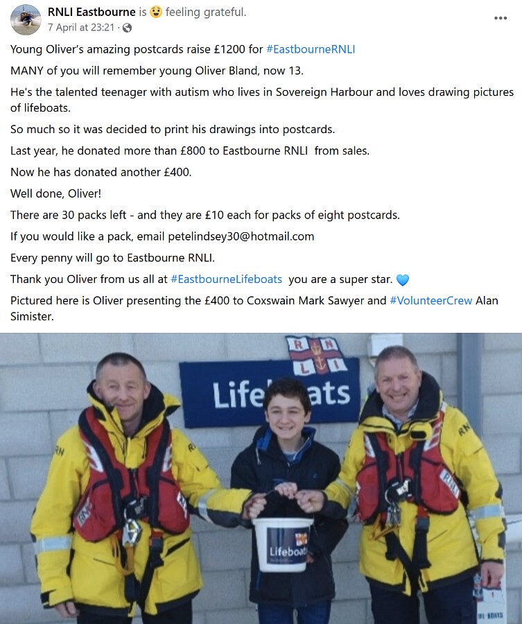 Sales of Oliver's postcards raised over £1200 for the RNLI